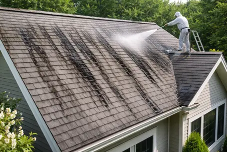 Do not pressure wash a roof. The safer method is a professional soft wash that kills algae without blasting off shingle granules.