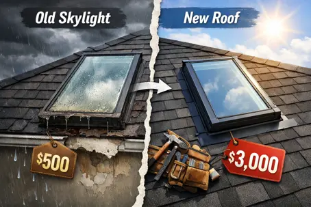 If you are replacing your roof and you have older skylights, ask us to price both options side by side: keep and re-flash vs replace now.