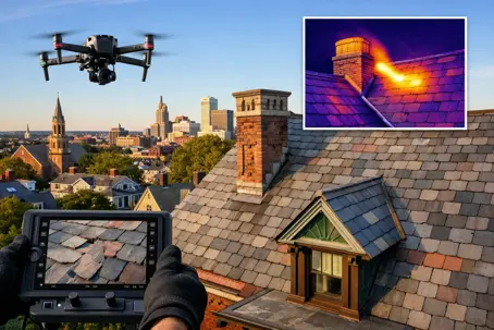 Mighty Dog Roofing de Rhode Island ofrece inspecciones de tejados con drones diseñadas para materiales históricos y el clima de Providence.